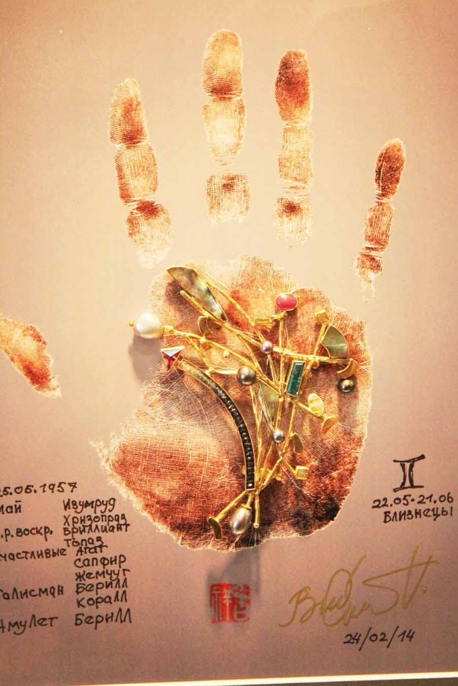 — Необходимо понимать, что каждый человек совершенно индивидуален. Эта неповторимость должна находить поддержку и в том, что человек носит, чем он себя украшает. Эксклюзивные произведения, которыми занимаюсь я, имеют более широкие функции, чем стандартные тиражируемые промышленностью. Зачастую я помещаю свои работы в рамку, как творения графики или живописи. В этом случае они превращаются в объекты и становятся частью убранства дома. Особенно ярко это проявилось в проекте «Хиромантия», идея которого была отмечена на мировом конкурсе дизайна в Италии золотым призом. Украшение формируется на основании линий руки будущего владельца, иначе говоря, человеческая индивидуальность воплощается в уникальной драгоценности, которая будет не только украшением для пиджака, сумки, но и появится в рамке на стене вместе с отпечатком руки. Таким образом, брошь становится домашним амулетом. На мой взгляд, у такого украшения появляются новые функции и возможности. Появляется некий семейный символ и ритуал, который меняет атмосферу в доме.