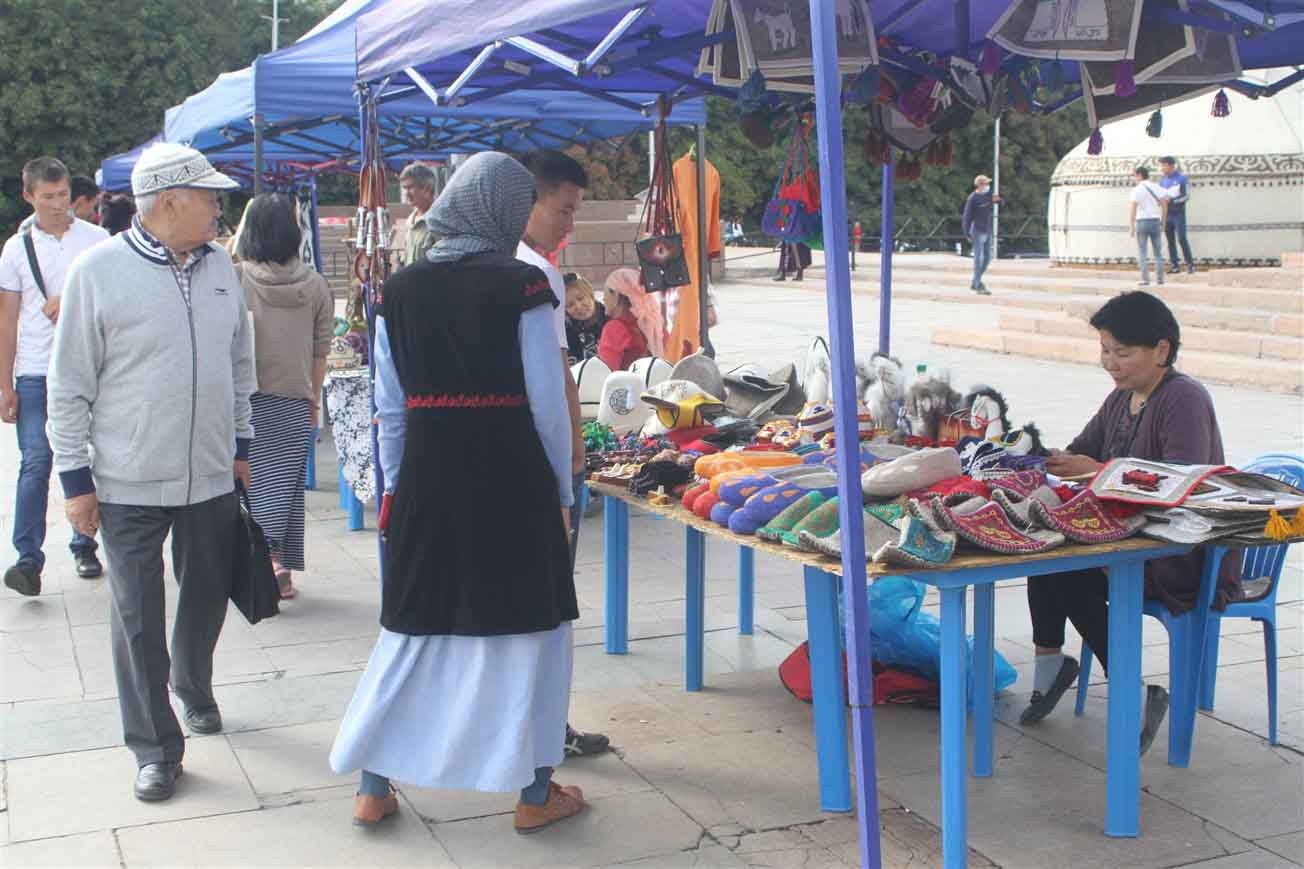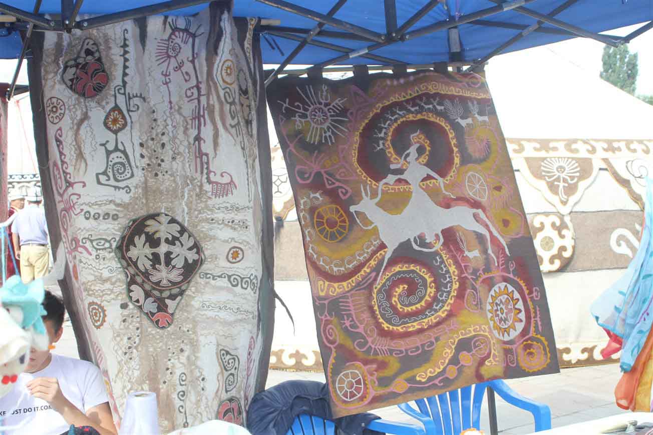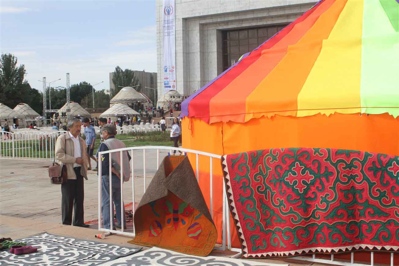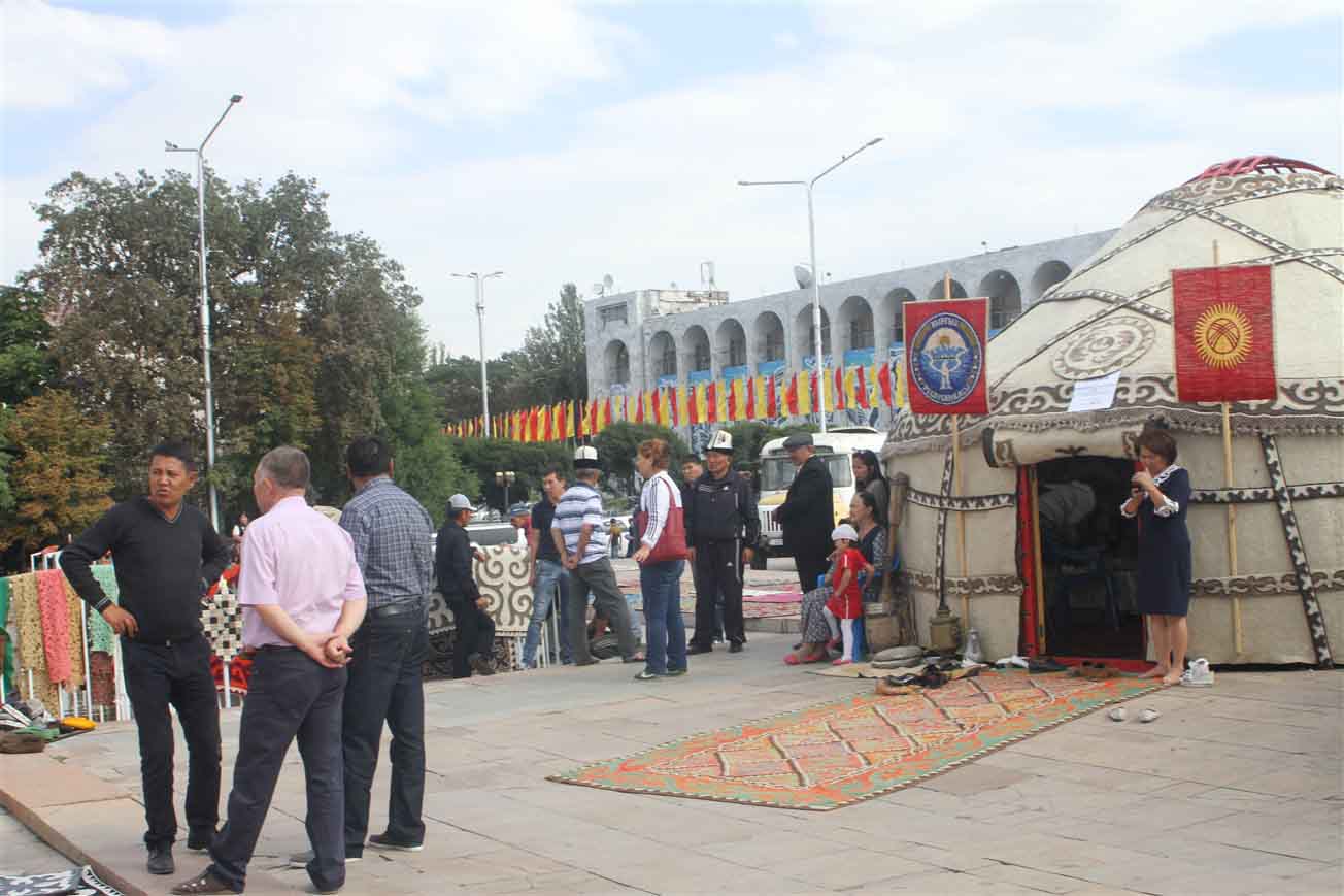 В самом центре столицы на площади «Ала-Тоо» были установлены более двадцати украшенных юрт, рядом с которыми расположились мастера. Ремесленники представили свои лучшие работы и приглашали посетить гостей этнографическую деревню «Кыргыз кочу».