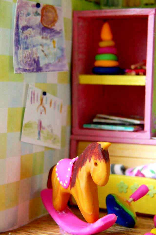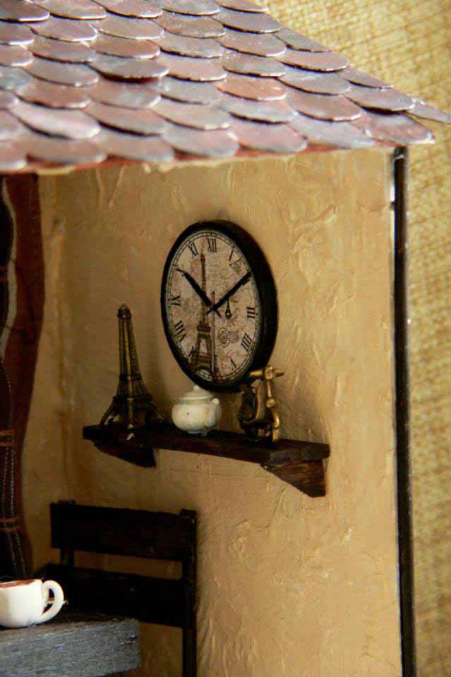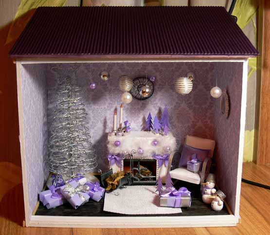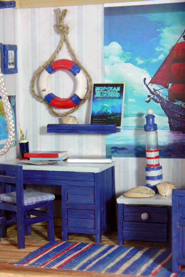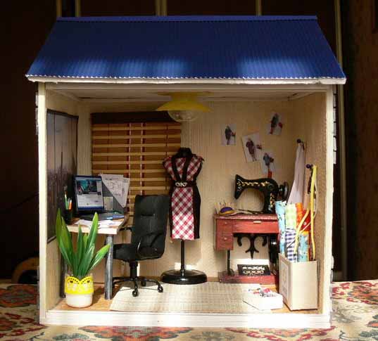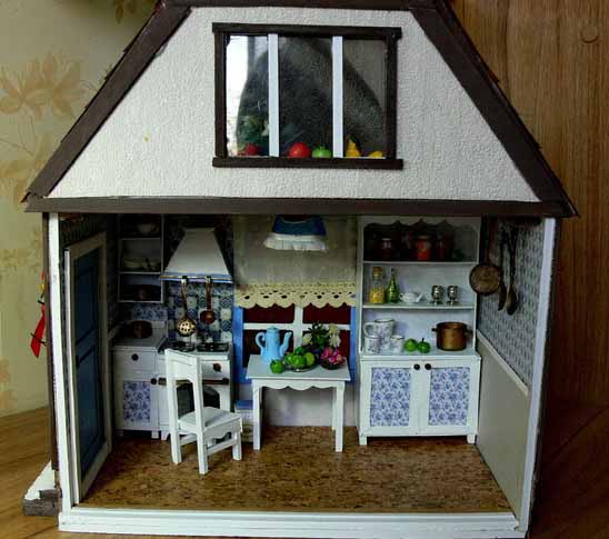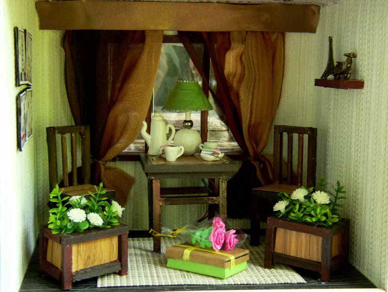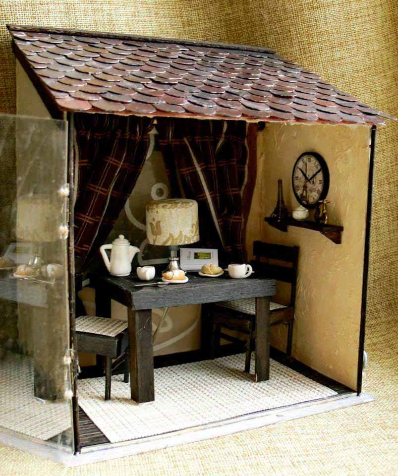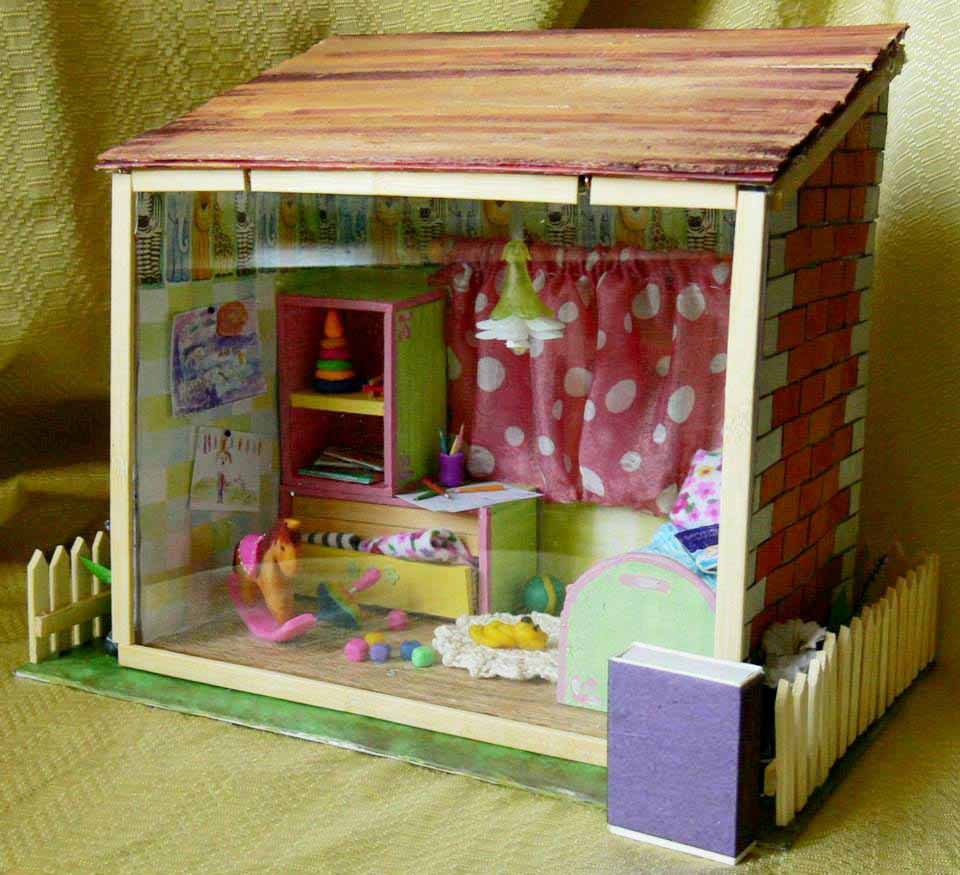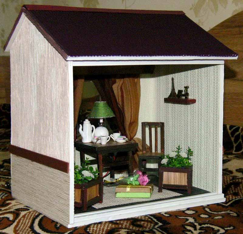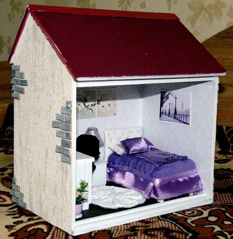 — На самом деле – это очень кропотливый труд. Все начинается с коробки, которая заполняется согласно моему представлению, что там должно находиться. Для изготовления мебели я использую плотный картон, его очень легко склеить и затем покрасить. Обои распечатываю из интернета или использую настоящие обои, которые подходят по цвету и фактуре. От недели до месяца с настойчивостью дизайнера приходится прорабатывать различные мелкие детали. Когда я делаю новый домик, сам процесс доставляет мне невероятное удовольствие. Ведь в каждый предмет интерьера я вкладываю душу и хочу, чтобы каждая кроватка, светильник или мишка, в первую очередь, радовали меня. В этой маленькой комнате я и столяр, и маляр, и электрик. Освоила уже почти все строительные специальности. Используя специальный пластилин, я дополняю домик различными игрушками и мелкими деталями, предварительно их запекая. После заполнение интерьером я занимаюсь внешней отделкой домика, даже черепицу я вырезаю и крашу вручную. Мелкие детали я приобретаю в специализированном магазине для мастериц, там продаются такие мелкие детали, которые позволяют предать еще большую реалистичность румбоксам. Здесь можно даже приобрести маленькие вилки и ложки и чашечки.
