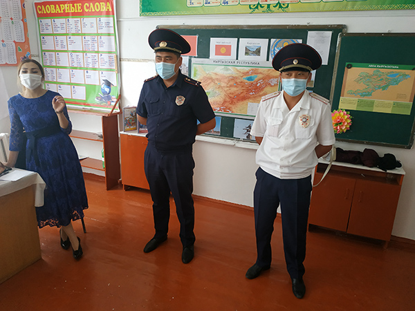 Неожиданно урок прервали сотрудники милиции. Инспекторы ООБДД УВД Иссык-Кульской области Максат Текеспаев и Нурлан Байлочев – частые гости в учебных заведениях. Вот и сегодня они пришли рассказать школьникам о правилах безопасности на дорогах.